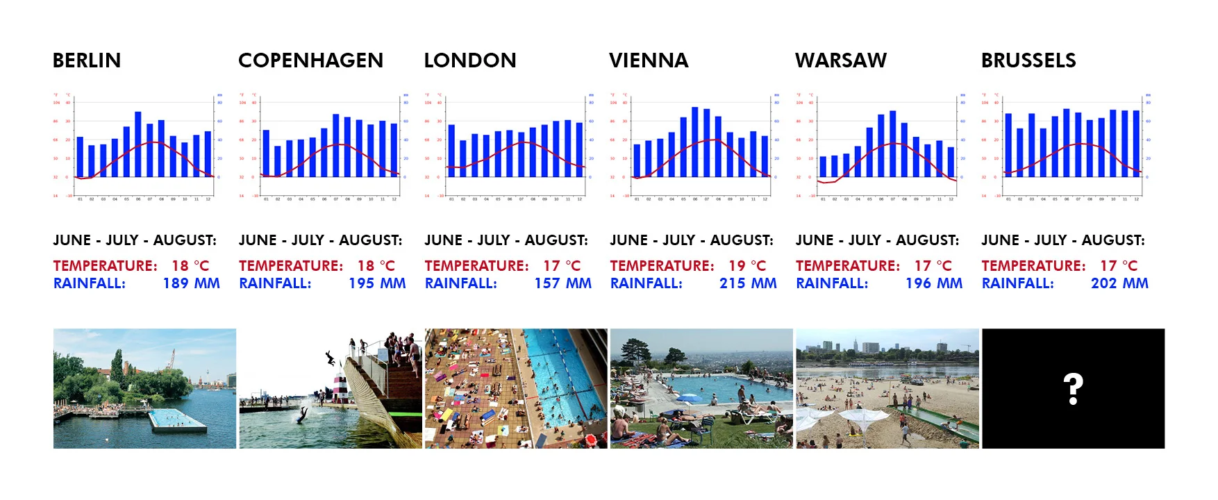 When presenting POOL IS COOL we're often confronted with the remark that the Brussels' weather is too bad for outdoor swimming. If you actually compare the summer months with other European cities you won't notice big differences, and still these cities have fantastic swimming possibilities.